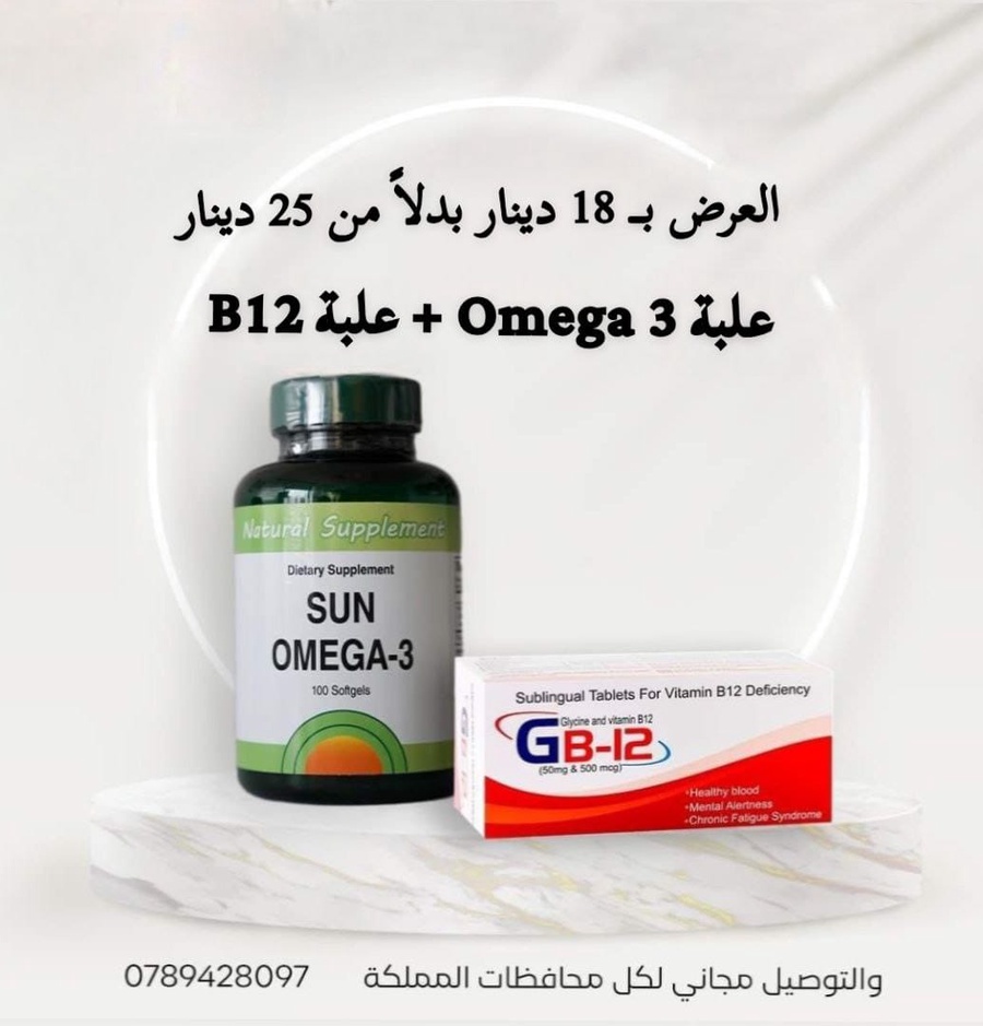 عرض مميز: علبة أوميغا 3 + علبة B12 لدعم صحة القلب والأعصاب والطاقة والمناعة بطريقة آمنة.